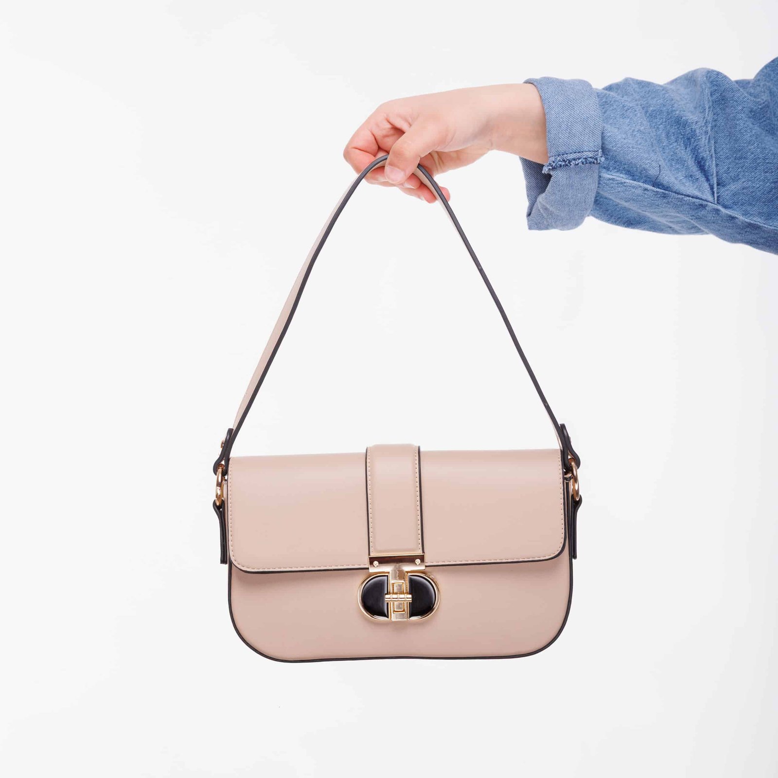 تأتي الحقيبة مزينة بتفاصيل معدنية ذهبية عصرية على الجزء الأمامي، تمنحها بريقًا راقياً وجاذبية مميزة. هذا العنصر البسيط يحوّل التصميم من عادي إلى أنيق جداً، لتناسب الحقيبة السهرات، المناسبات، أو حتى الخرجات اليومية الراقية.