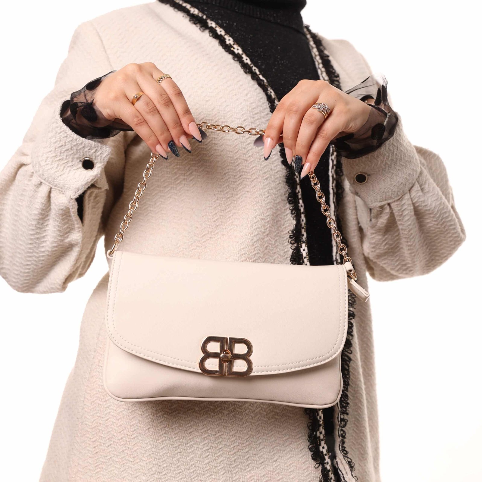 تأتي الحقيبة مزينة بتفاصيل معدنية ذهبية عصرية على الجزء الأمامي، تمنحها بريقًا راقياً وجاذبية مميزة. هذا العنصر البسيط يحوّل التصميم من عادي إلى أنيق جداً، لتناسب الحقيبة السهرات، المناسبات، أو حتى الخرجات اليومية الراقية.